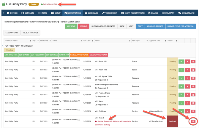 - To remove the declined item(s) they can go to the Occurrences tab and select the red trash can icon next to the one that says Declined.