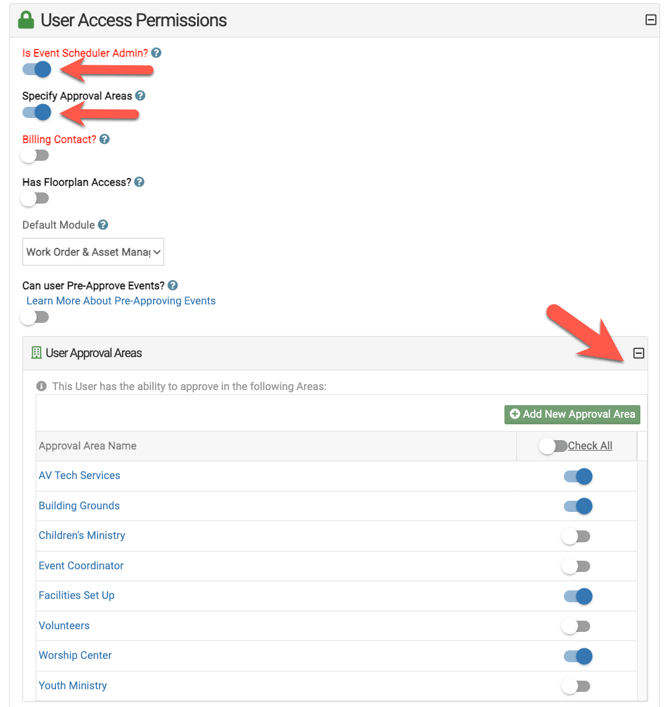 When in an admin's profile, after selecting them to be an Event Admin select Specify Approval Areas, and under User Approval Areas, select their Approval Area(s) and click Save.