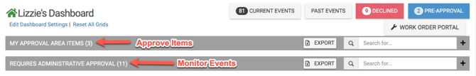 In this grid, when the Admin (with the sub-admin role) clicks "Approve" on an event in their My Approval Area Items" grid, only the items in their approval area on that event will be approved. They will not approve the whole event, like when they click Approve on an event when it's in the "Requires Administrative Approval" grid.