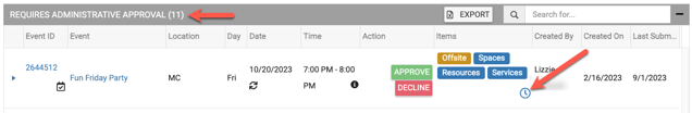 - Remember, admins approving events in the "Requires Administrative Approval" grid should only do so after confirming that all sub-admins have approved their items. They will confirm this by reviewing the items still pending approval by clicking on the clock icon on the event.