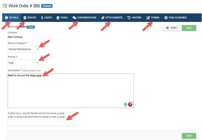 Admins and Sub-admin with permission to manage: After submitting a work order, admins and sub-admins (with permission to manage work orders) can edit anything on any work order that is submitted by any user based on the department(s), service category(s), location(s) they have access to under their user permissions.