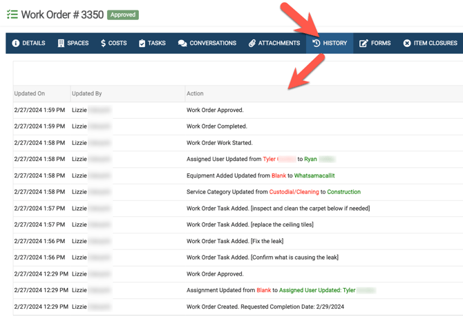 All changes that get made to a work order can be tracked on the History tab of that work order and seen by all users. There you will see which user made which update or edit and when it was made.